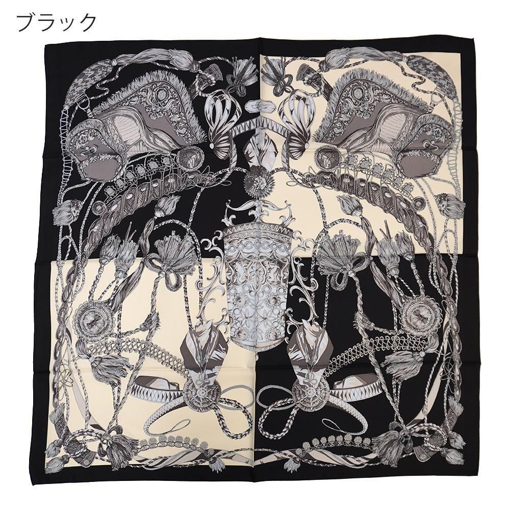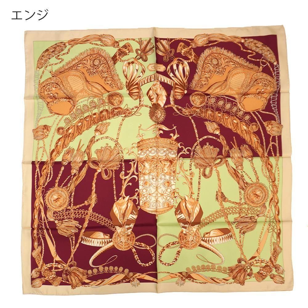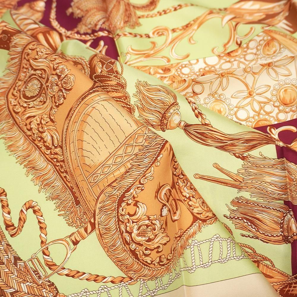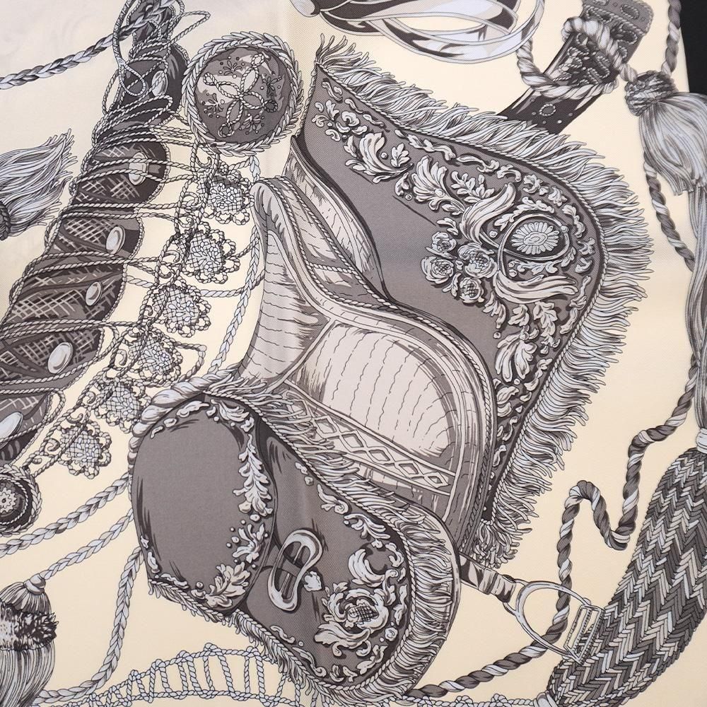 華麗な装飾が施された式典用の馬具をバランスよく描いたスカーフ。鞍やロープにタッセルなど細部まで緻密に描かれています。