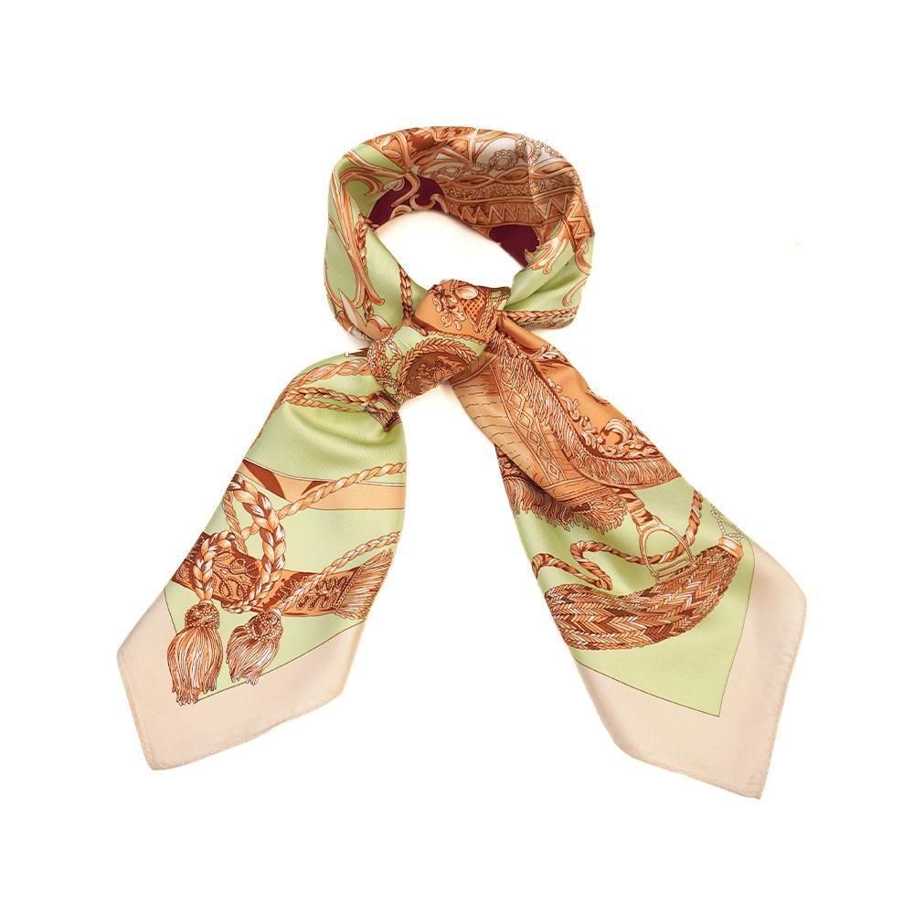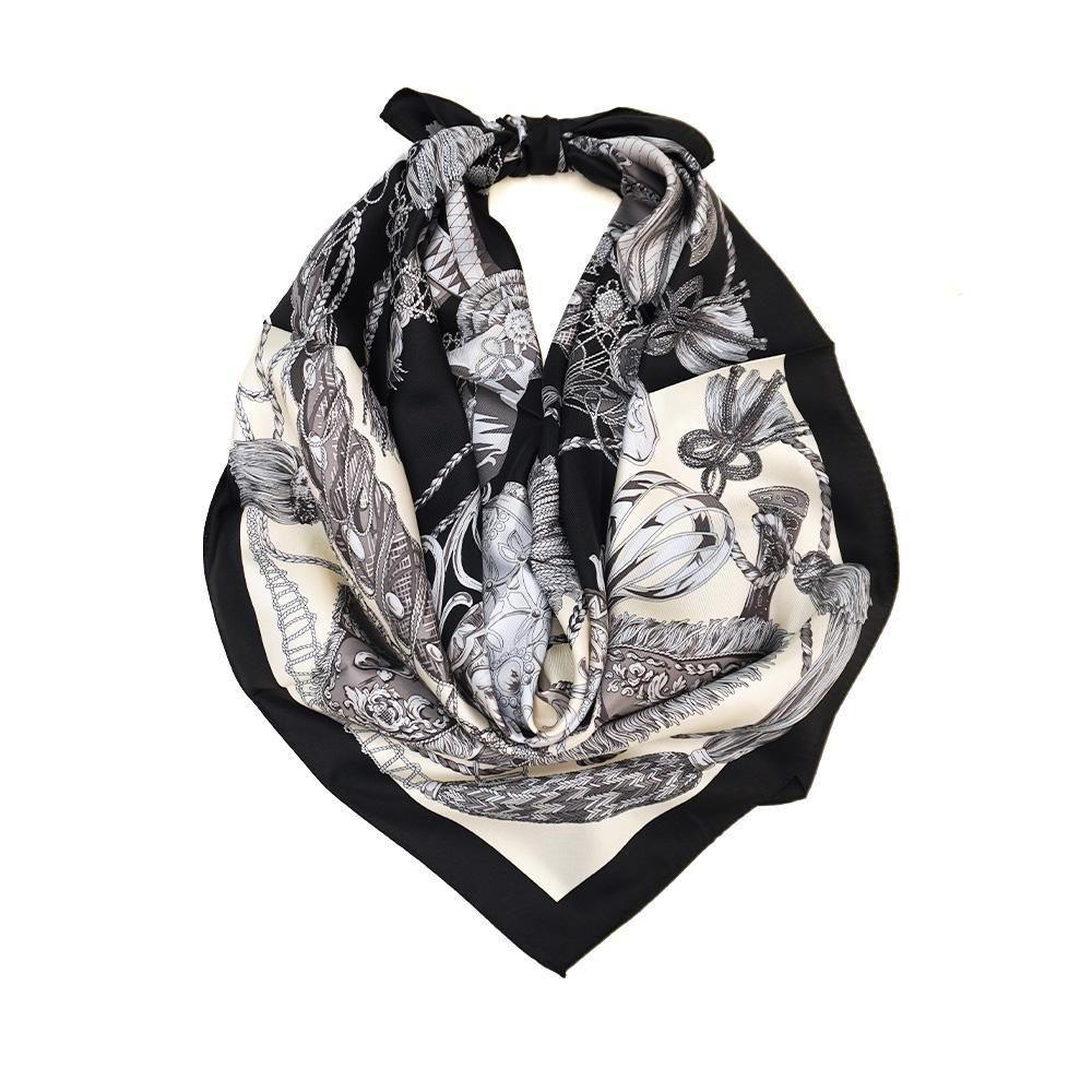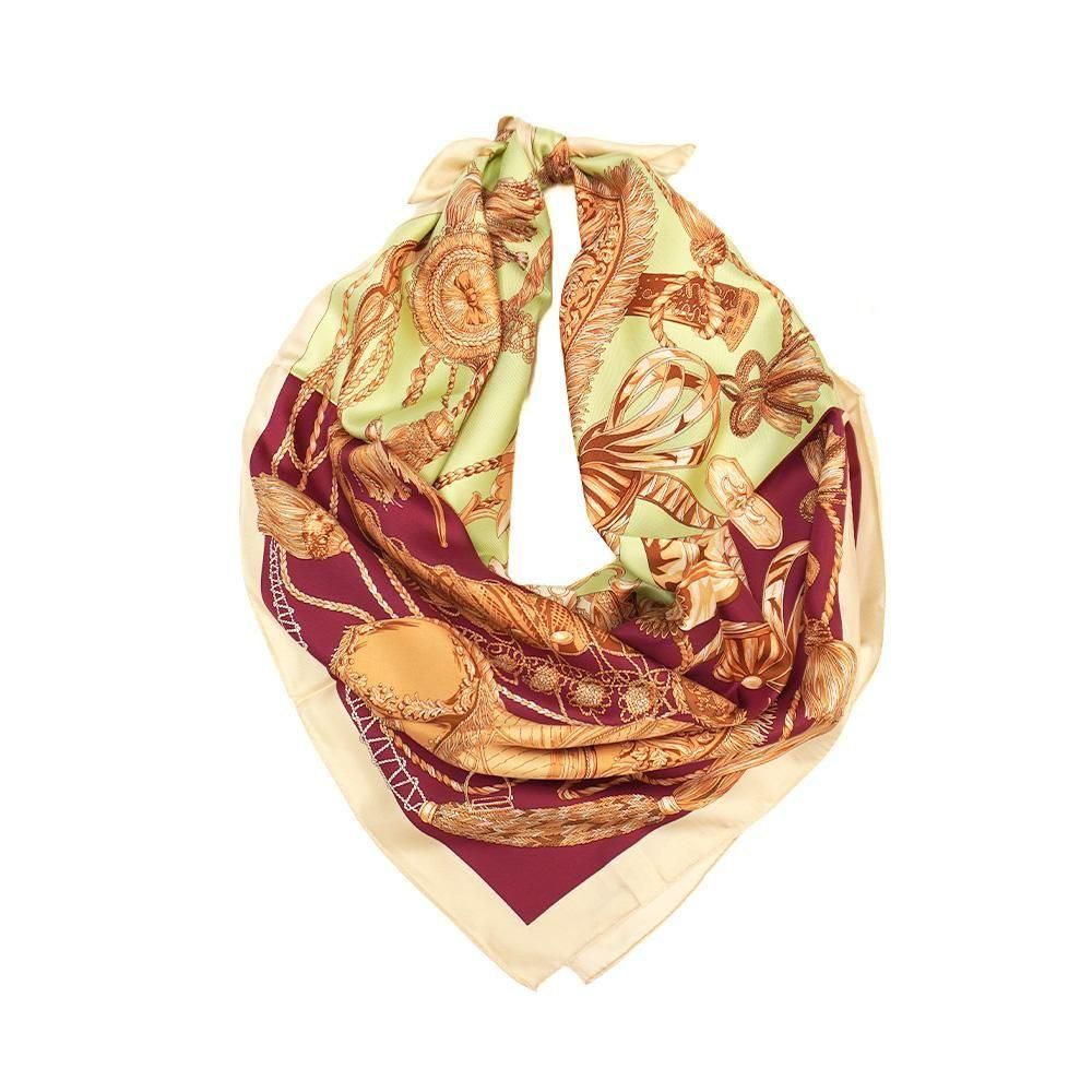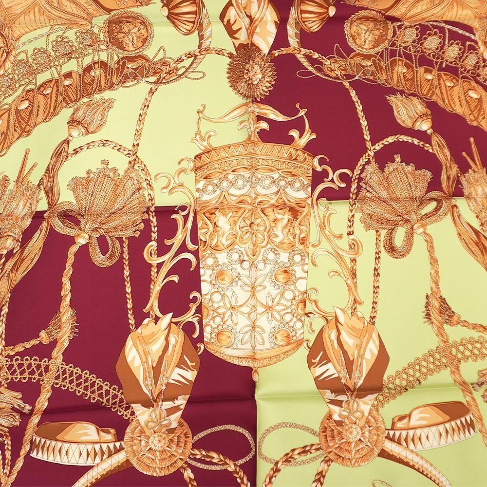 華麗な装飾が施された式典用の馬具をバランスよく描いたスカーフ。鞍やロープにタッセルなど細部まで緻密に描かれています。
